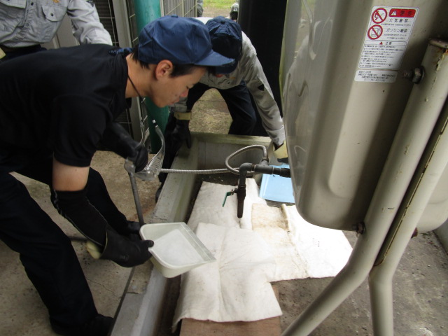 避難訓練・漏洩訓練・工場近隣の清掃活動を行いました 10月31日(金)避難訓練・漏洩訓練・工場近隣町道のゴミ拾いを実施いたしました。 消火訓練1 火元の消火訓練 消火訓練2 消火訓練、工場長訓示 漏洩訓練1 灯油漏洩訓練 漏洩訓練2 薬品漏洩訓練 清掃活動1 近隣町道の清掃活動 清掃活動2 近隣町道から回収されたゴミ