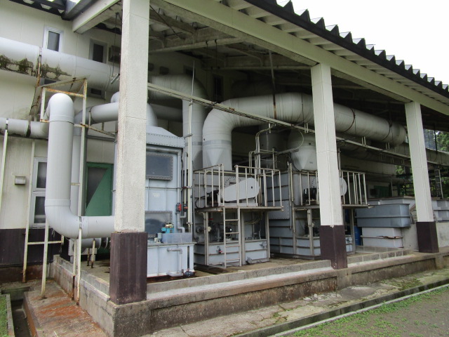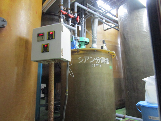 中和排水処理設備 排水処理水としては比較的リスクの低い中和処理水として産廃業者へ引き渡しております。 シアン系処理設備 シアン系排水は、自社でアルカリ塩素法によるシアン分解処理を行い、パックテスト後に中和処理水として産廃業者へ引き渡しています。 排ガス処理・洗浄装置(スクラバー) 製造現場の排気装置から発生する有害ガスを吸着、水洗、薬液中和処理を行い大気に放出しております。