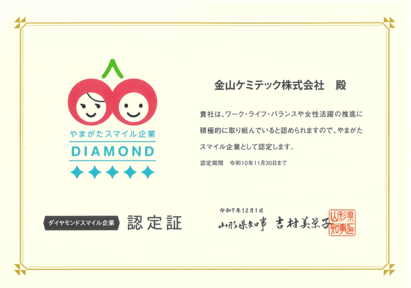 やまがた ダイヤモンドスマイル企業 認定 やまがたスマイル企業上位のダイヤモンドスマイル企業に認定されました。 誰もがいきいきと働き、幸せに暮らし続けられる山形県に向け、「ワーク・ライフ・バランス」や「女性活躍」の推進に取り組んでいる企業等を県が認定する制度です。 ダイヤモンドスマイル企業として、社員みんなでより働きやすい会社・女性の活躍をサポートする会社にして行きます。 やまがたスマイル企業認定 やまがた ダイヤモンドスマイル企業 認定